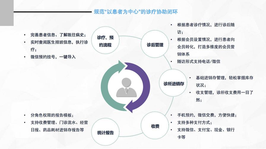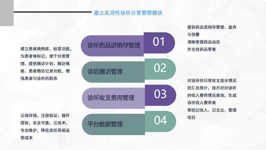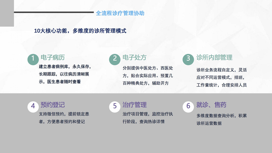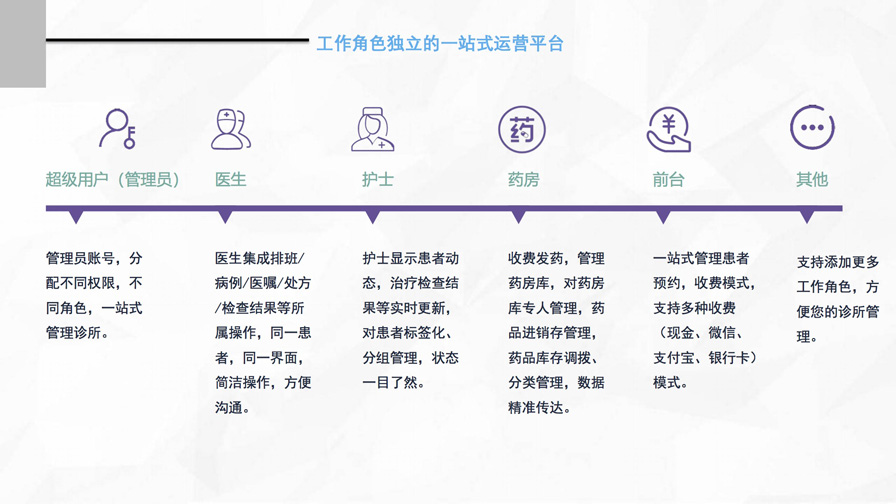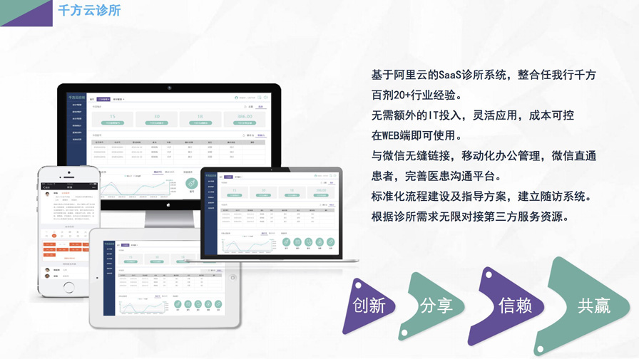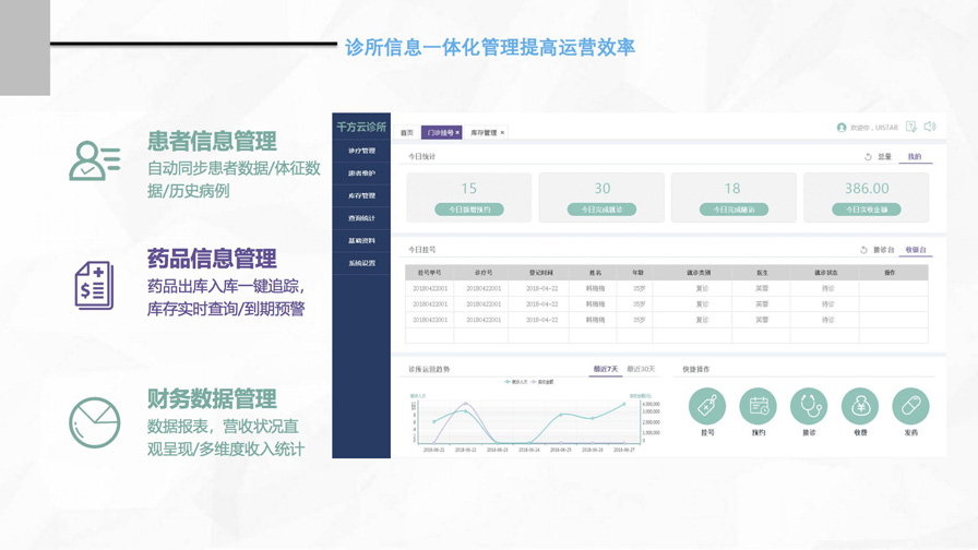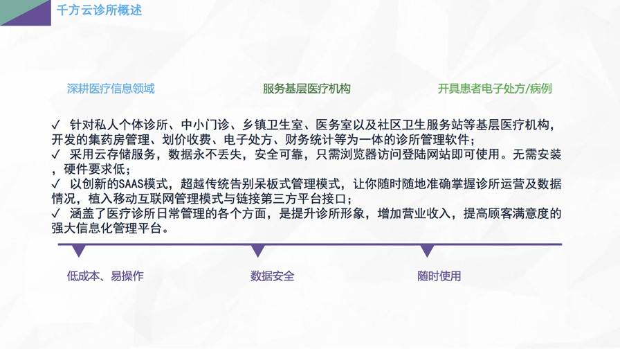 千方云診所是集藥房管理、劃價(jià)收費(fèi)、電子處方、財(cái)務(wù)統(tǒng)計(jì)、中醫(yī)智能診斷等為一體的診所管理軟件。采用云存儲服務(wù),數(shù)據(jù)永不丟失,安全可靠,只需瀏覽器訪問登陸網(wǎng)站即可使用。